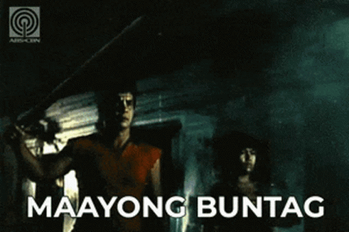 Fernando Poe Jr. (FPJ) wields a glowing sword in a scene from a Kapamilya Teleserye, featuring 'Maayong Buntag' text.