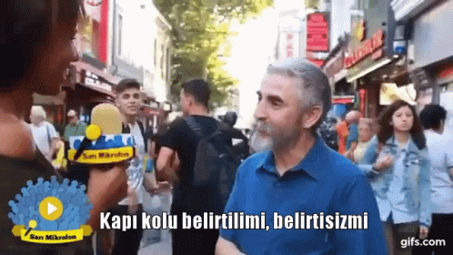 A street interview where a woman asks a man about the literary concept of 'Kapı kolu belirtilimi, belirtisizmi' (door handle, specified or unspecified).