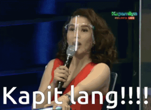 Karylle, wearing a face shield, encourages with the Filipino phrase 'Kapit Lang!' (Just Hold On).