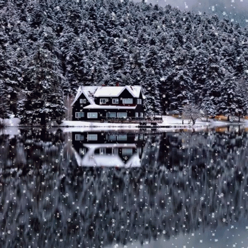 A picturesque snowy house by the serene Gölcük lake in Bolu, Turkey, surrounded by a dense forest.