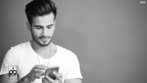 Karan Tacker intently checking messages on his mobile phone in a black and white shot.