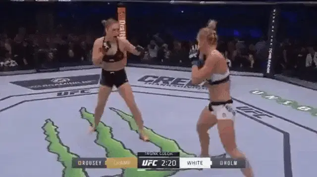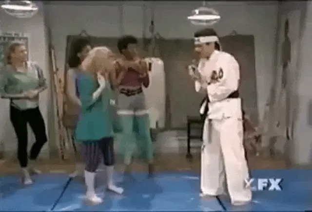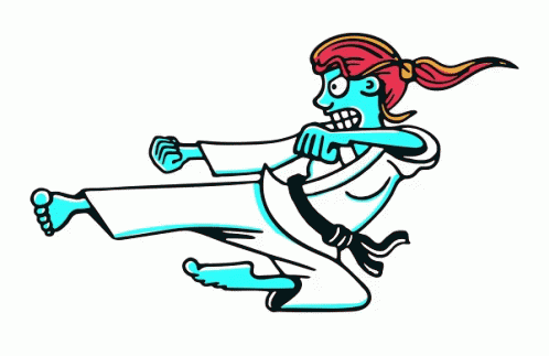 Cartoon karate girl with an angry face performs a powerful kick, ready for a fight or competition.