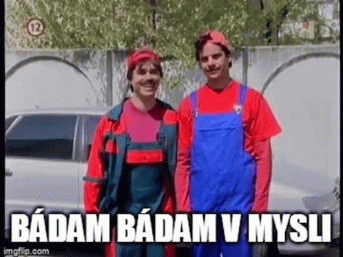 Karci and Lajci, two men in colorful overalls, stand beside a car with the text 'Bádam Bádam V Mysli'.