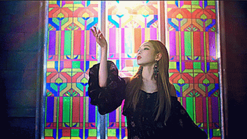 KARD Somin in her 'Bomb Bomb' music video, posing elegantly against a vibrant stained glass window.