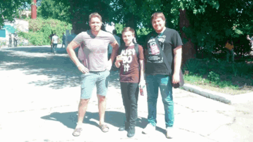 Karlik (карлик) in a 'Just Do It' shirt dances energetically while two friends stand by in a park.