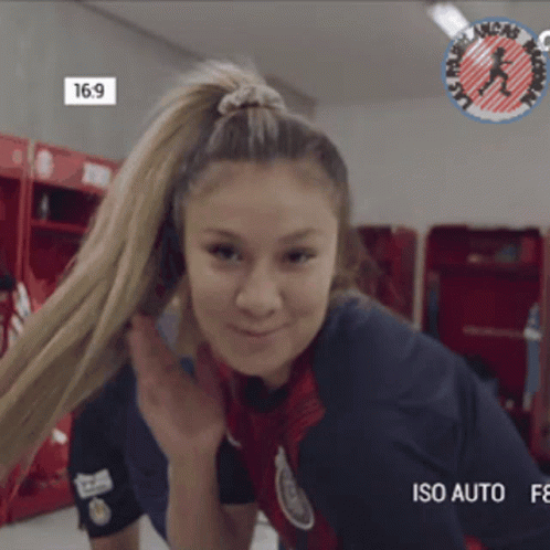 Karol Bernal, a player for Chivas Femenil, shares a playful moment in the locker room.