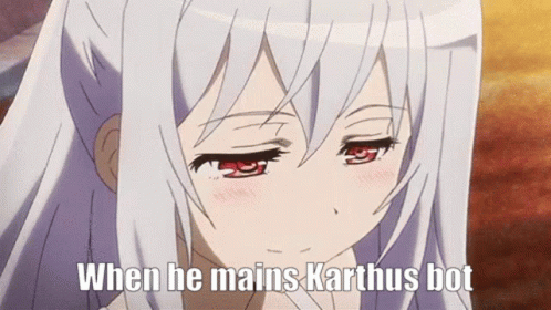 Anime girl with white hair and sparkling eyes reacts excitedly to the phrase 'When he mains Karthus bot'.