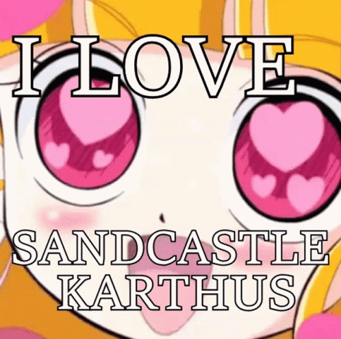 Anime character with heart eyes and text 'I Love Sandcastle Karthus' displayed.