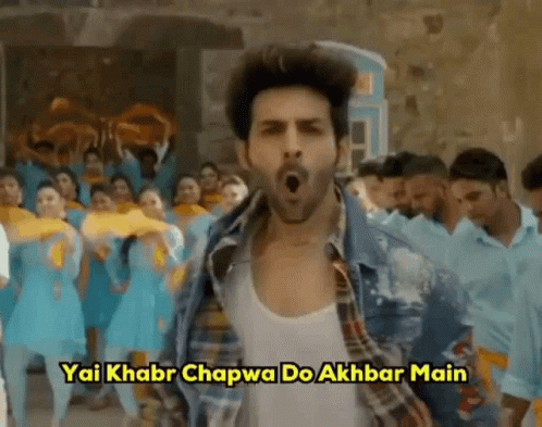 Kartik Aaryan singing 'Yai Khabr Chapwa Do Akhbar Main' in front of a crowd.