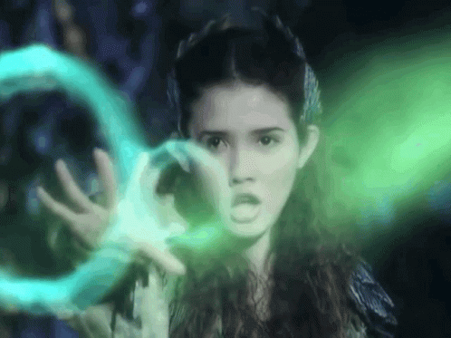Karylle as Alena from Encantadia, casting a spell with glowing green energy.
