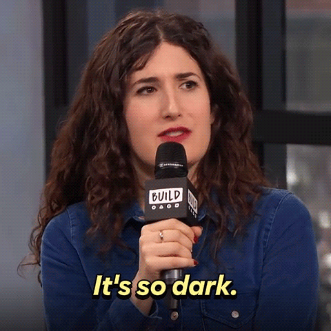 Kate Berlant speaks into a microphone at a BUILD Series event, saying 'It's so dark' with a thoughtful expression.