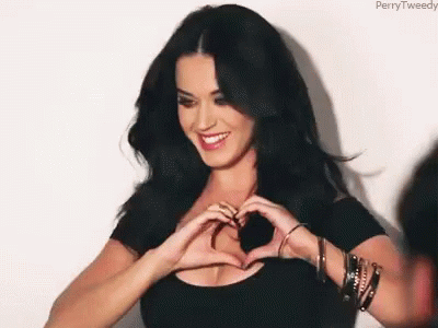 Katy Perry smiles brightly while forming a heart shape with her hands over her chest, expressing love.