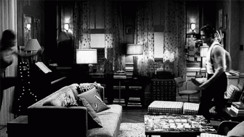 A man and woman joyfully embrace in a living room, sharing a moment of deep affection.
