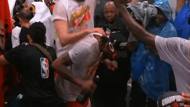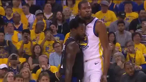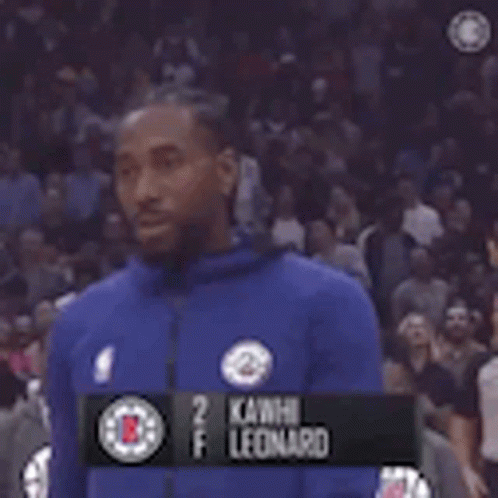 Kawhi Leonard, player for the Clippers, holding a microphone during a game.