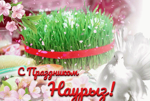 A vibrant greeting card celebrating Nauryz in Kazakhstan, featuring green grass, cherry blossoms, and a white dove.