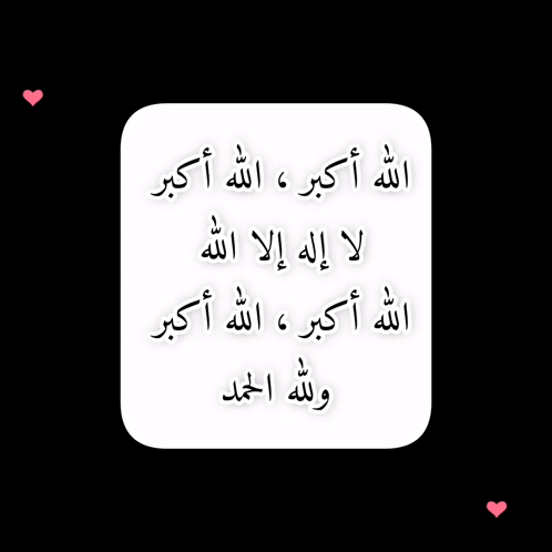 Animated display of the Islamic Takbir 'Allahu Akbar' with pink hearts, celebrating Eid and remembrance of Allah.
