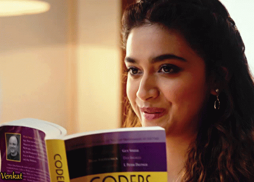 Keerthy Suresh reacts with a mix of smiles and tears while reading the book 'Coders at Work'.