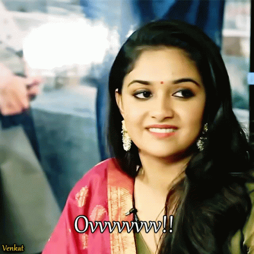 Keerthy Suresh reacts with an 'Ovvvvvv!!' expression during an interview, looking surprised and amused.
