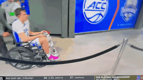 Cooper Flagg, also known as Keffa, is seen being pushed in a wheelchair past ACC Tournament banners.