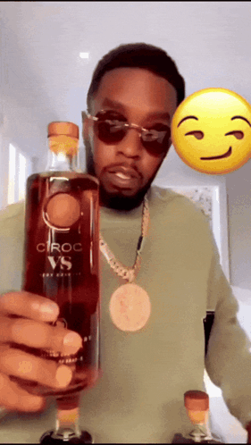Sean 'Diddy' Combs proudly displays two bottles of Ciroc VS cognac, wearing sunglasses and a gold chain.