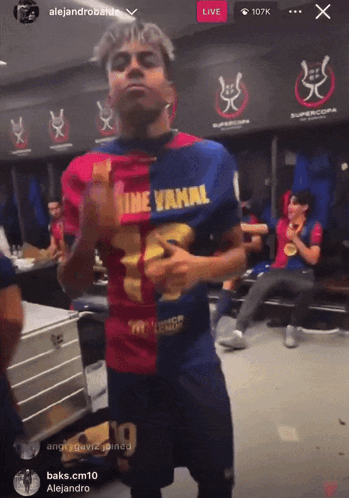 Keffa Lamine Yamal celebrates in the locker room, wearing his half-red, half-blue FC Barcelona jersey.