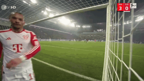 Keffa Sane celebrates a goal in his Bayern Munich jersey on the football field.