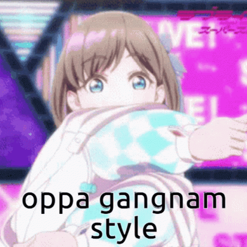 Keke Tang from Love Live! Liella in an 'Oppa Gangnam Style' pose with text.