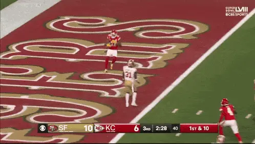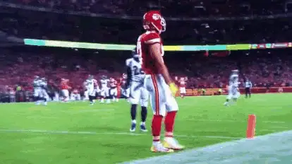 Kansas City Chiefs player Kelce on the football field during a game, celebrating a play.