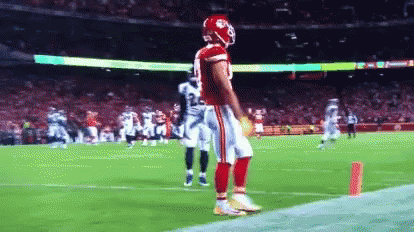 Travis Kelce celebrates on the football field during a game, wearing his red and white uniform.