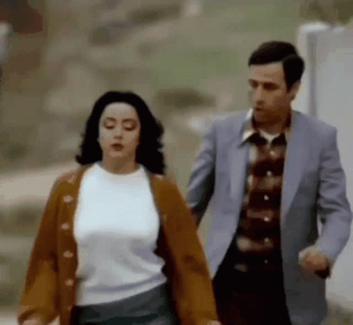 Kemal Sunal and a woman run together down a street in a comedic scene.