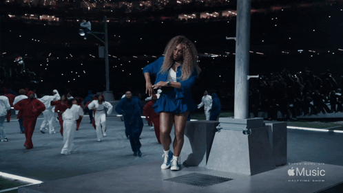 a woman in a blue dress is dancing in front of an apple music halftime show sign