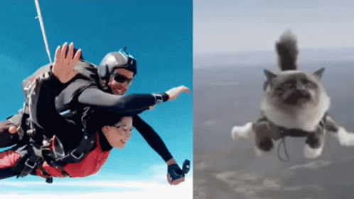 Kenia Os and Juanpa Zurita skydiving in a split screen, with a humorous flying cat.