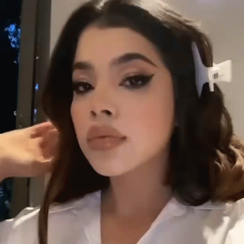 Kenia Os poses for the camera, showcasing her makeup and a stylish hair clip.
