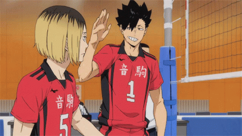 Kenma and Kuroo from Haikyuu!! share a moment on the volleyball court in their Nekoma jerseys.