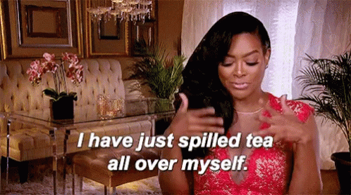 Kenya Moore dramatically declares she has spilled tea all over herself in a living room setting.