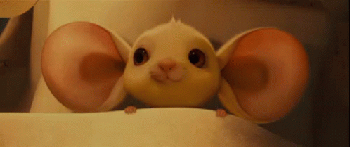 A cute cartoon mouse with unusually large, round ears peeks over a surface, looking adorable and curious.