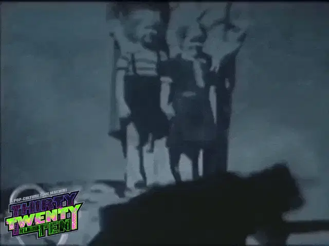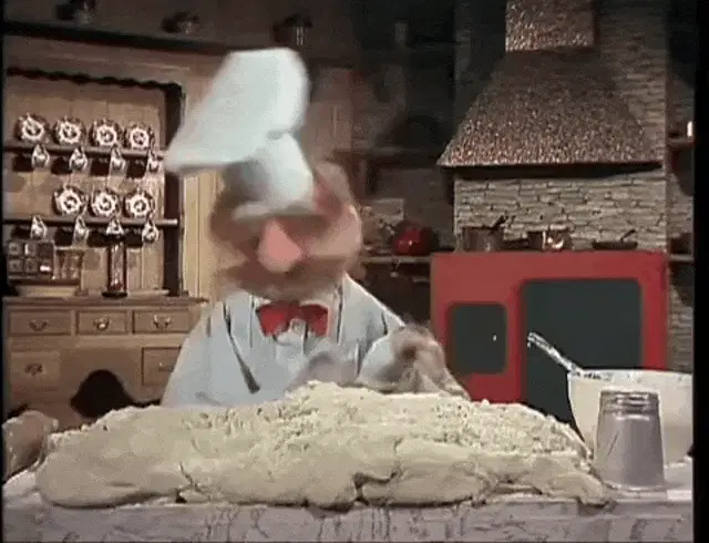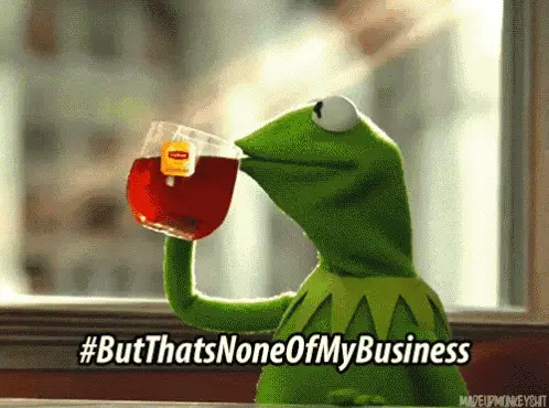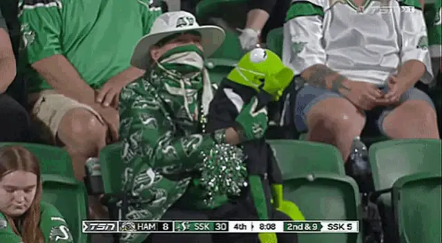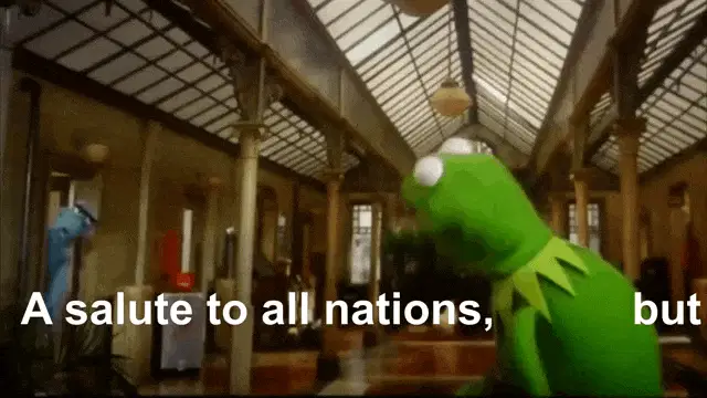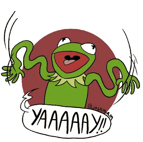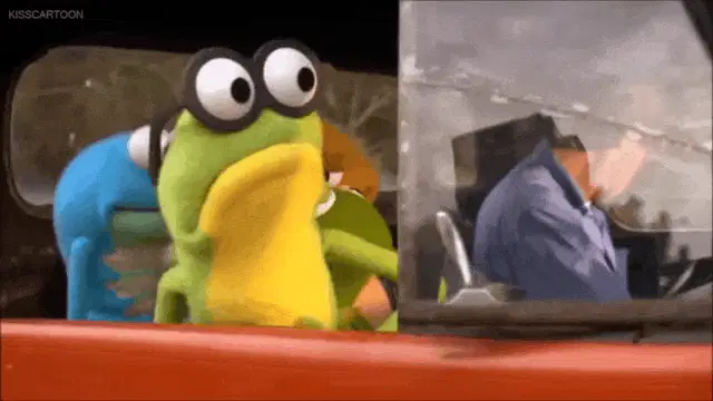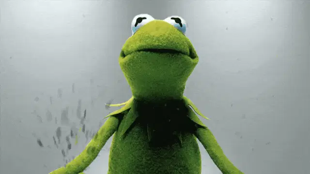 Kermit the Frog puppet with his mouth wide open, singing or shouting in front of a red curtain.