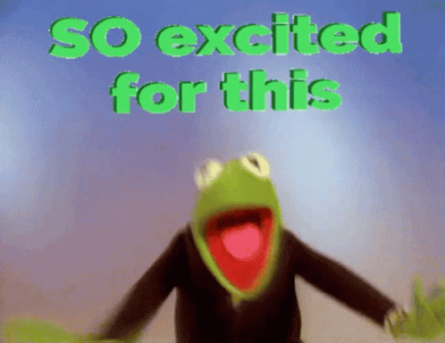 Kermit The Frog joyfully throws his arms wide, expressing extreme excitement with the text 'SO excited for this'.