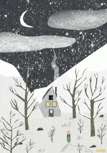 Ketketusha's animated illustration of a serene snowy winter night with a cozy house and bare trees.