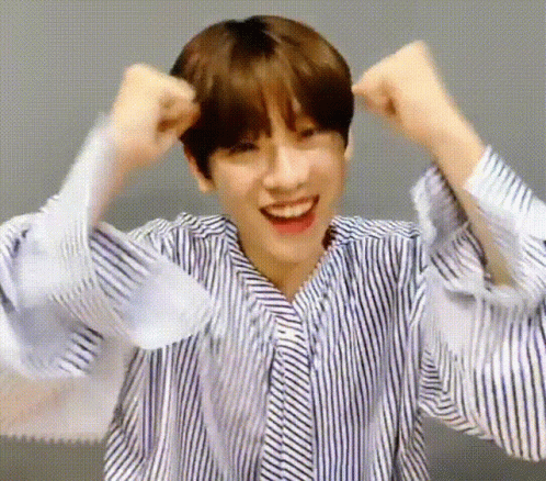 Keum Donghyun smiles brightly, making an excited gesture in a striped shirt, showing his joyful mood.