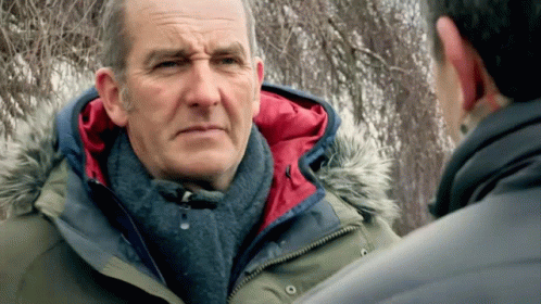 Kevin McCloud, known from Grand Designs, looks concerned while talking to someone outdoors in a parka and scarf.