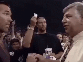 Scott Hall interacts with a fan while Kevin Nash watches in the crowd at WCW Monday Nitro.