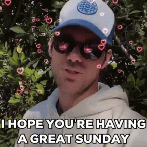Kevinmcgarry, wearing a hat and sunglasses, wishes viewers a great Sunday amidst floating hearts.