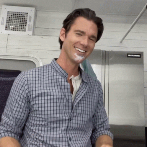Kevin McGarry smiles and dances, giving thumbs up with shaving cream on his face, wearing an unbuttoned plaid shirt.