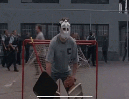 Kevinvernal Ricky, from Trailer Park Boys, plays goalie in a street hockey game and makes a save.