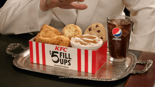 KFC $5 Fill Ups meal featuring fried chicken, biscuit, side, cookie, and Pepsi on a silver tray.