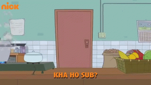 Gopal, from Golmaal Junior, stands in a kitchen doorway, angrily asking 'Kha Ho Sub?' (Where is everyone?).