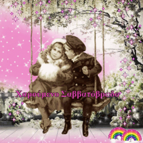 Two children, a boy and a girl, sit on a swing amidst a sparkling pink background, wishing a happy weekend.