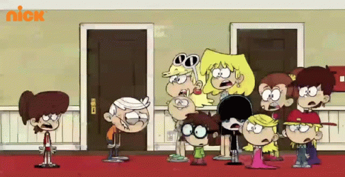 The Loud House characters, the sisters and Lincoln, happily singing and laughing in a hallway.