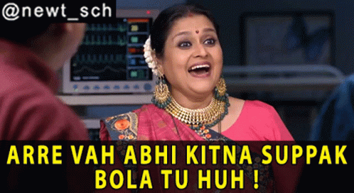 Supriya Pathak from Khichdi laughs heartily at the phrase 'Arre Vah Abhi Kitna Suppak Bola Tu Huh!' on a monitor.